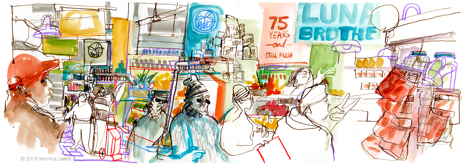 Recently, in the name of progress, the old market has been closed, and many of the vendors have moved across Delancey to the brand new “Essex Crossings” market. That one has more space and more chi-chi restaurants, but it’s lost that neighborhood soul. In the early spring of 2019, I had a chance to make a few drawings of the old place just before it shut down, preserving the memory of one of the last old school places of the city.