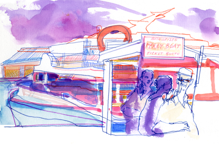 It’s called watercolor heaven! There were several artists and craftsman lined up harborside selling small paintings and bags, whatever they made. I’m thinking that this could be my retirement plan – snorkeling in the morning, painting in the afternoon, maybe a rum punch in the evening. Not a bad working day, maybe I won’t wait until retirement! I’ll leave you with one last watercolor – the ferry to paradise island ticket booth.  Although I think we were already there…