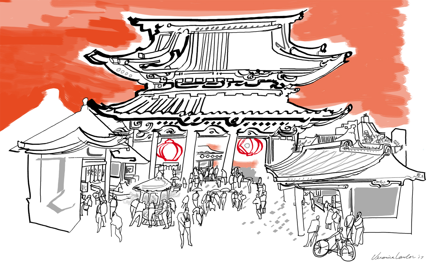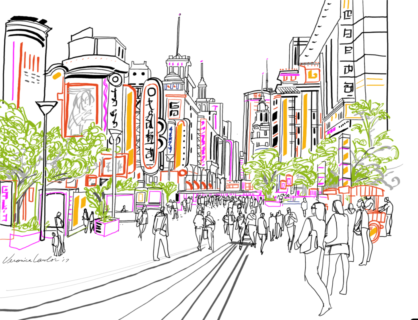 Above is a part of the drawing I made of the Shanghai skyline, which is such an exciting skyline by the way. Feels like a space station, and at night, it lights up like a jukebox. Shanghai is such an interesting combination of old and super-modern: I didn’t really have a chance to see much of it as I landed on Monday afternoon and left on Wednesday noon time, but the impression it made on me makes me fairly certain that I’ll visit again some day.